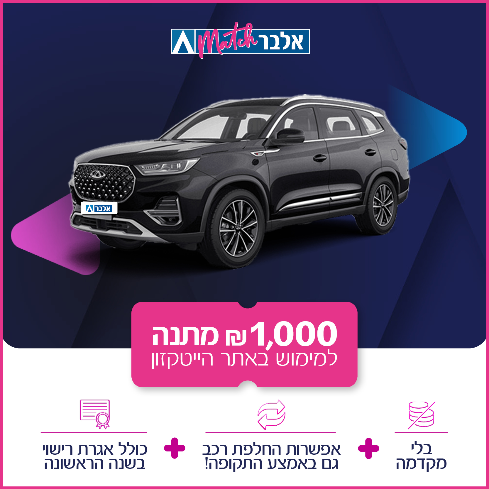 מבצע שובר של 1500 ש"ל לעסקאות שייסגרו מ 15.11.25 עד ל 30.11.25 (לרכבים עד 184,990 ₪), לחברה אין אחריות על טיב השובר, השובר יישלח ללקוח עד 14 ימי עסקים לאחר מסירת הרכב החדש. בעסקאות מבצע אלו יהיה פיצוי מוסכם בהחזרה מוקדמת של : 3 תשלומים מראש ב 12 חודשים הראשונים ותשלום מראש ב 24 חודשים הנותרים.