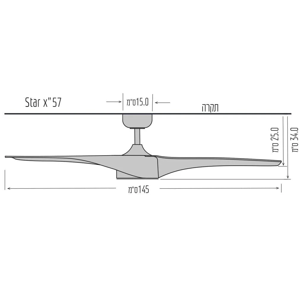 ״57 = 144.78 ס״מ 3230 LUMEN NET יורד מהתקרה: 33 ס״מ הספק: מנוע DC מתקדם, 48W ניתן להרכיב בתקרה משופעת של עד 18 מעלות