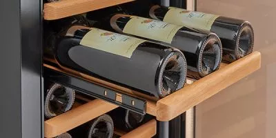 מדפי עץ עמוקים ונשלפים על מסילות, מאפשרים ניצול אופטימלי של נפח המקרר יחד עם גישה נוחה לכל בקבוק ובקבוק.